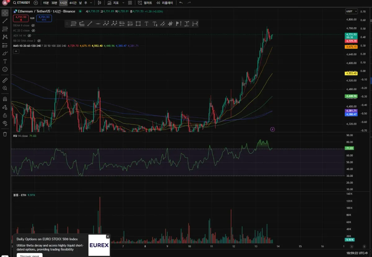 RSI 지표를 보면 70을 넘겨 과매수 상황으로 보이며 가격또한 고점을 찍음
