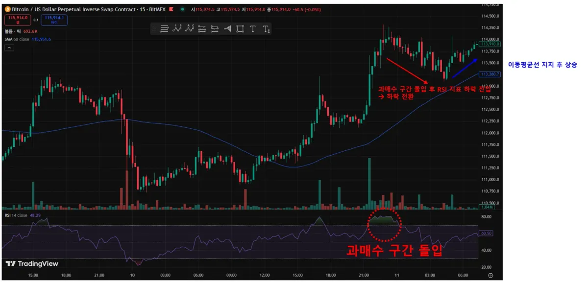>과매수 구간 돌입 후 RSI 지표 하락 진입하며 하락 전환, 이 후 60 이동평균선 지지 받으며 반등 하는 모습