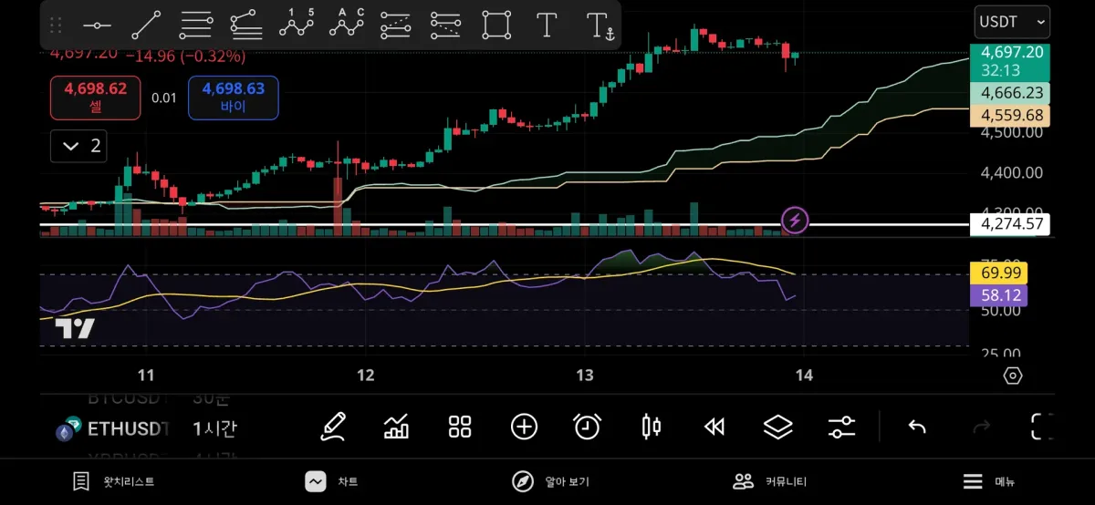 현재 단기적인 상승 추세에 있는 이더리움인데, 아직 rsi가 과매수 구간에 있지 않고, 미국의 경제 상황도 코인의 상승가능성이 높은 쪽으로 흘러가는 것으로 보아 더 상승할 여력이 높아보입니다.