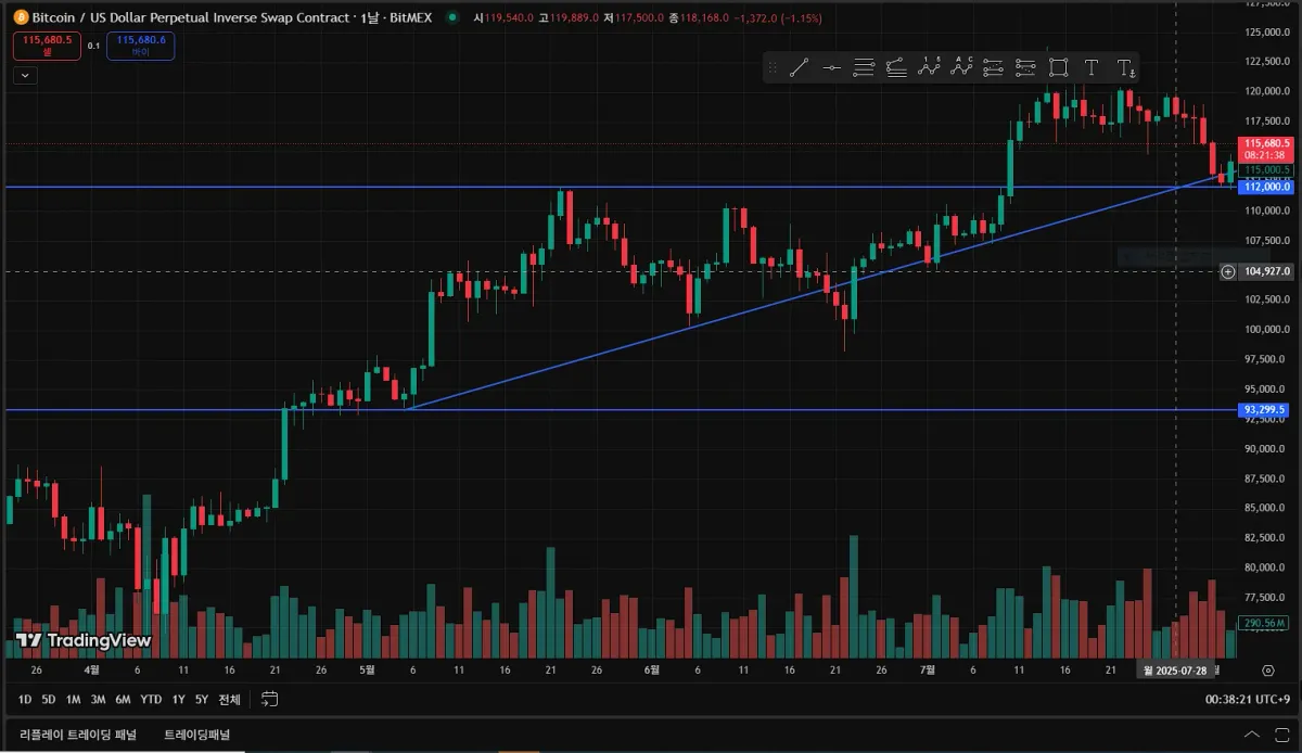 1. 비트코인 일봉차트에서 작도 실습입니다.