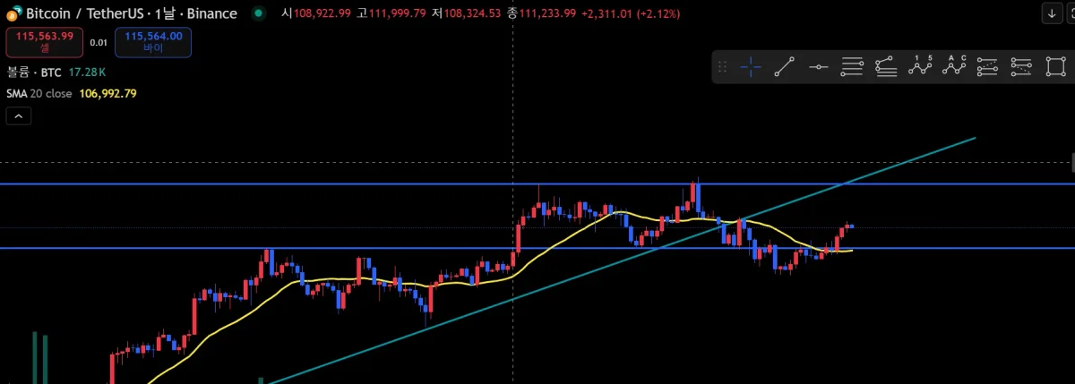 비트코인 일봉차트이며 지금은 강세추세에서 약세로 넘어가는 구간이라 생각이들며 , 횡보중이라 생각 됩니다.