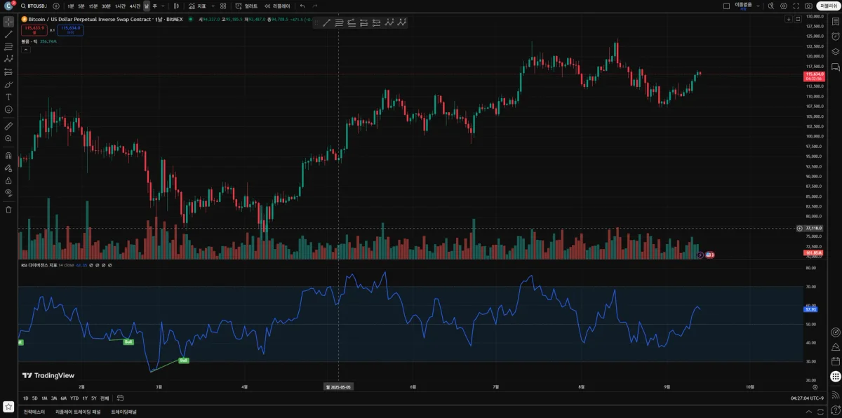 트레이딩 뷰 화면에 RSI 지표를 추가하고 확인해보는 시간을 가졌습니다.