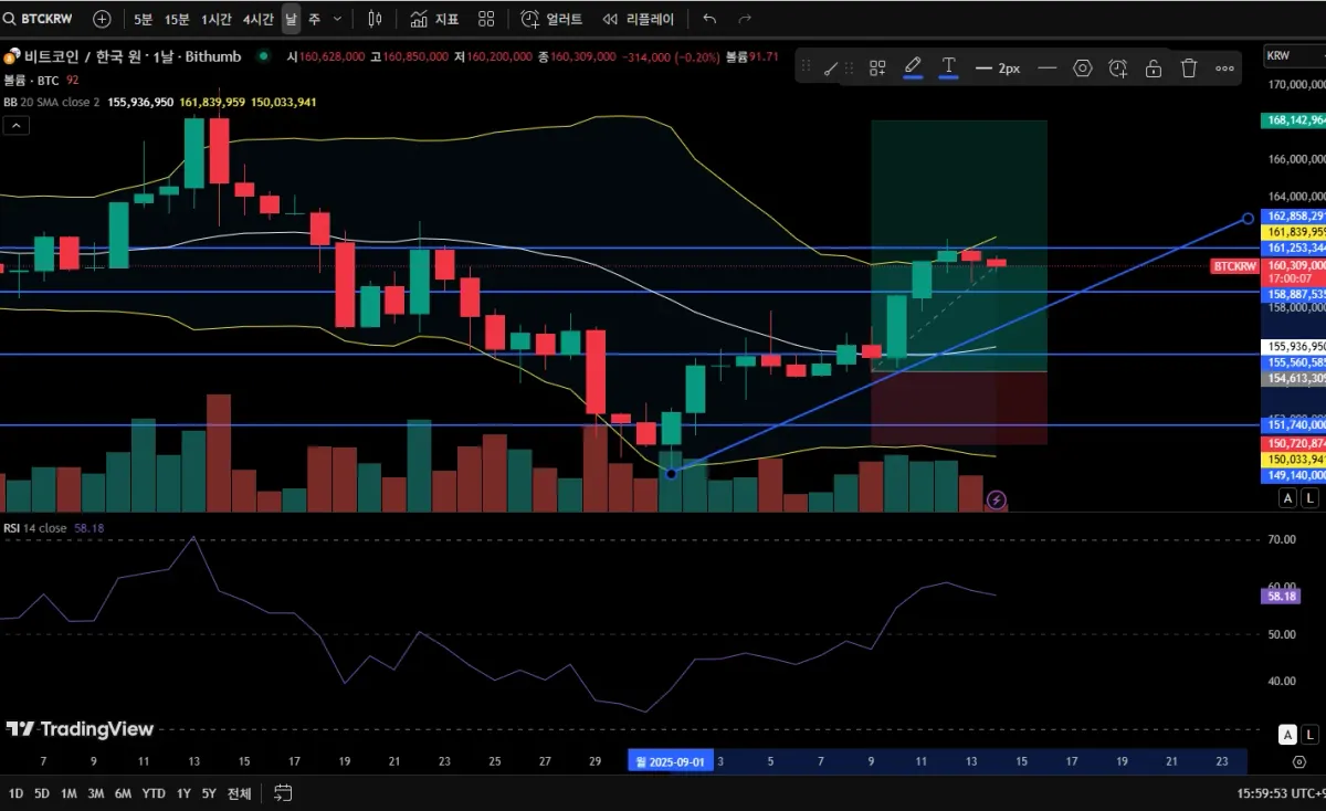 매수근거 : 9/1일 까지 비트코인의 가격이 내려가고 손절라인 부근에서 9/2일 반등과 동시에 RSI가 상승하며 상승 추세로 바뀌었다 이후 매도가로 내려오면 매수를 하고 그대로 올라간다면 지지와 반등을 확인후 매수를 진행 만약 그대로 추세에 따라서 상승한다면 1차 매도가에 지지를 확인 후 상승시 매수