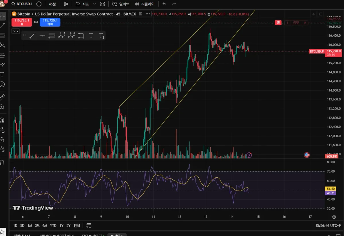 고점 저점 추세선을 찍었을때 고점이 좀 들락날락하긴 하지만 라이징 웻지 패턴이라는 생각이 들었습니다