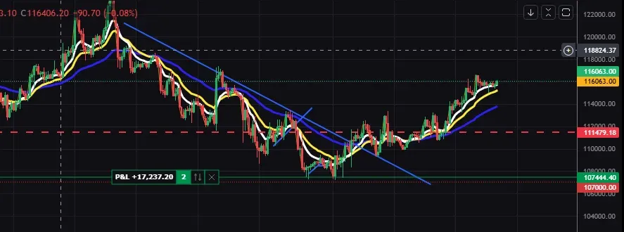 107k 부근에서 계속 상단 파란 선을 맞으며 하락 중 107k 부근이 1차로 충분한 지지 매물대라 생각해 비트 1개 진입 이때까지만 해도 추가 하락이 더 있을 수 있다는 생각에 손절을 짧게 가져가고 109k까지 상승했다가 다시 하락 후 107k 자리에서 비트 1개 추가 진입 손절은 짧게 107000 부근이었고 홀딩 중 저항 역할을 하던 50MA선을 뚫고 올라가 그대로 계속 홀딩 111479 부근에서 큰 하락 없이 지지를 계속 지켜서 지금까지 홀딩 했고 월요일(9월14일) 상황 보고 1개 익절 후 나머지 홀딩 생각 중입니다