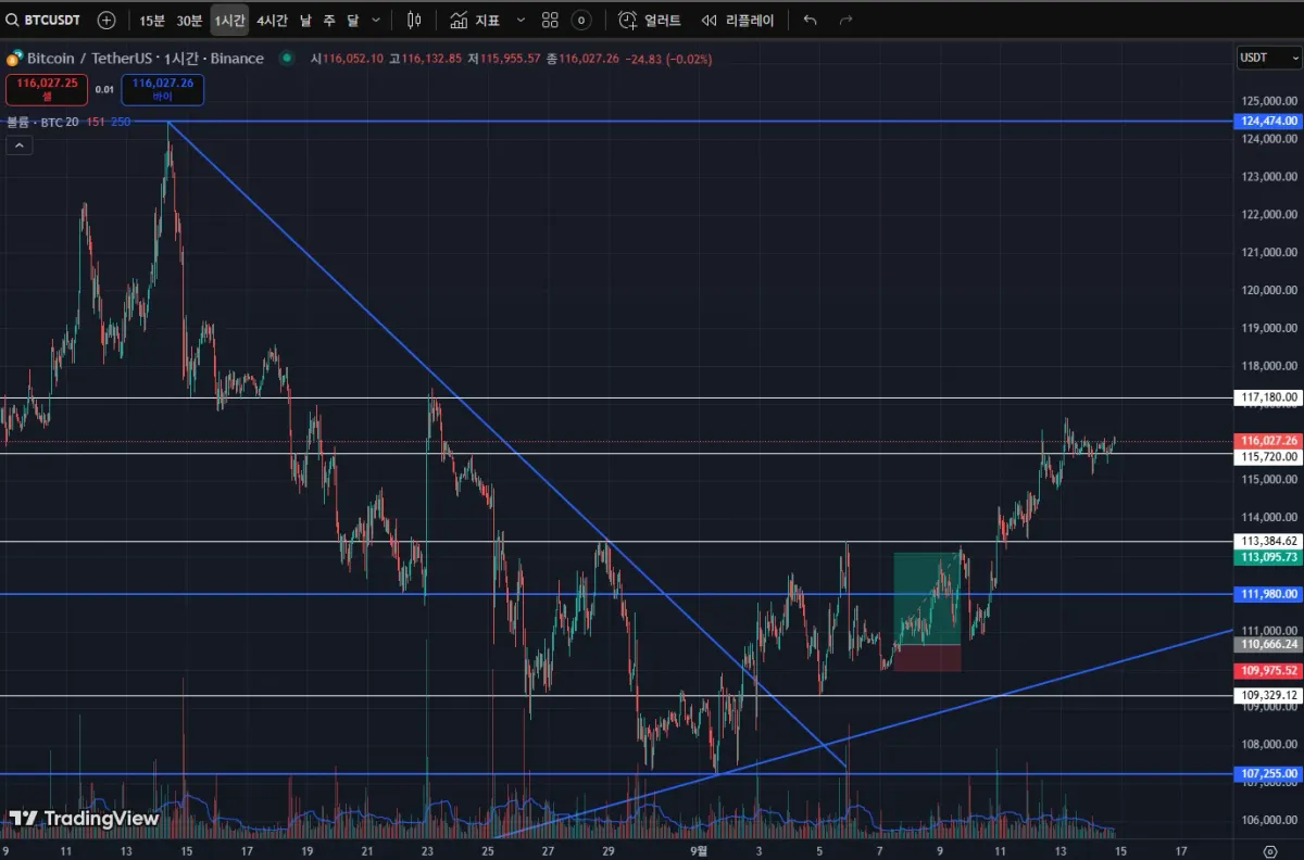 하락 저항선 돌파 후 상승 추세라 판단하였고 전저점에 손절, 전고점 근처에서 익절하는 손익비 3.5의 전략으로 매수 포지션 진입.