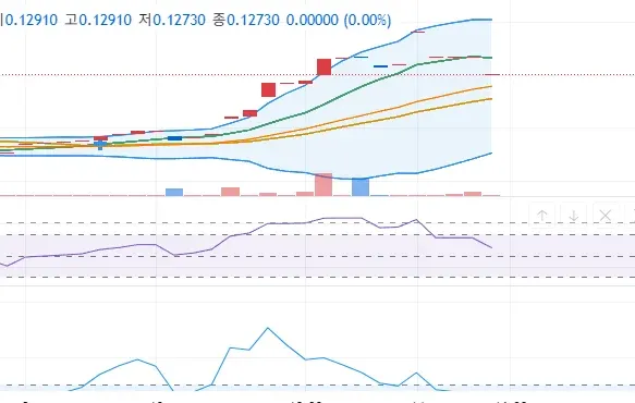 캔들은 최근에 셰속 상승을해서 볼린저밴드 상단을 치고 올라가는 모습이고 고점이 점점 높아지고 있다.