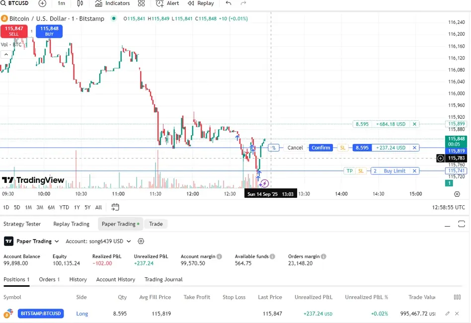 단기적인 관점에서 박스권에서 상승 돌파를 예상하고 롱 포지션을 잡았는데 박스권 하방으로 이탈하였습다. 잠깐의 상승 후 다시 하락할 것 같아서 115,741 구간에서 추가 매수 후 115,848 구간에서 매도 후 약간의 수익이 발생했습니다.