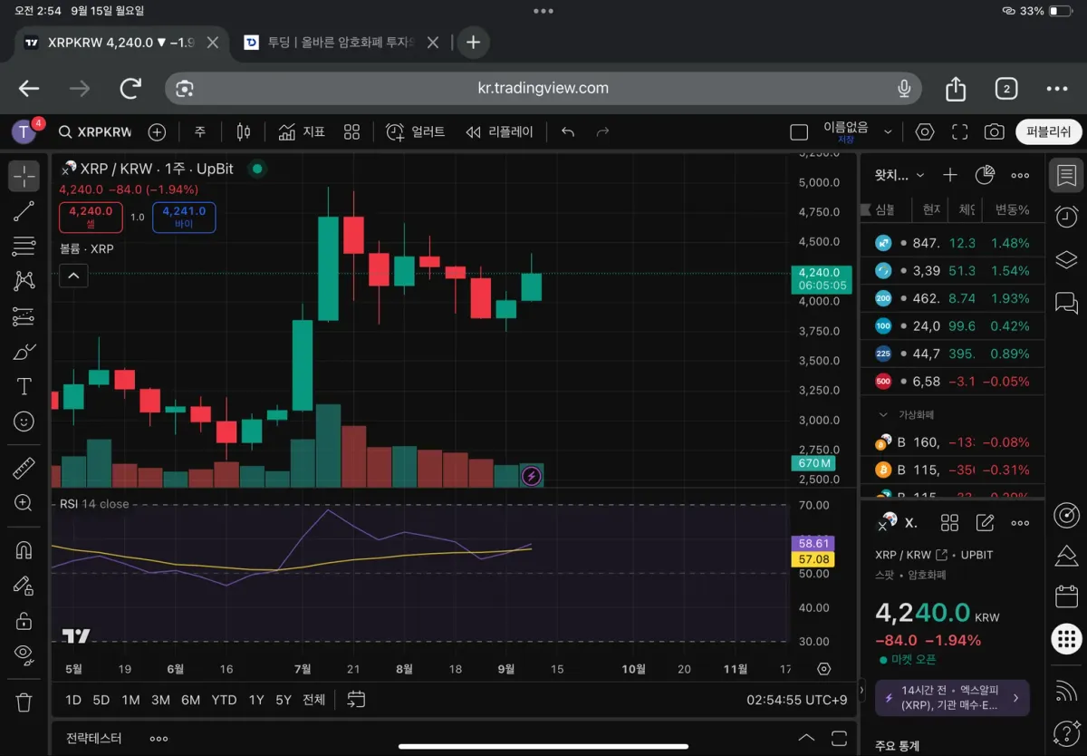 리플은 3500원 지지선과 5000원 저항선 사이에서 박스권을 형성하고 있으므로, 3500원 지지선 근처에서 매수하는 전략을 고수하고 5000원 저항선 사이에서 매도하는 전략을 고수해야겠습니다.