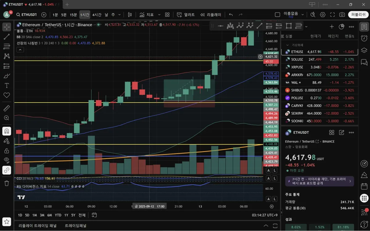 9/12일에 이더리움이 피보나치를 큰 거래량과 함께 돌파 한 후 피보나치에서 지지받을 때 롱 포지션 진입했습니다. 진입가 4510, 손절가 4493, 익절가는 전고점인 4563으로 레버리지 30배로 진입하여 전량 익절완료 했습니다.