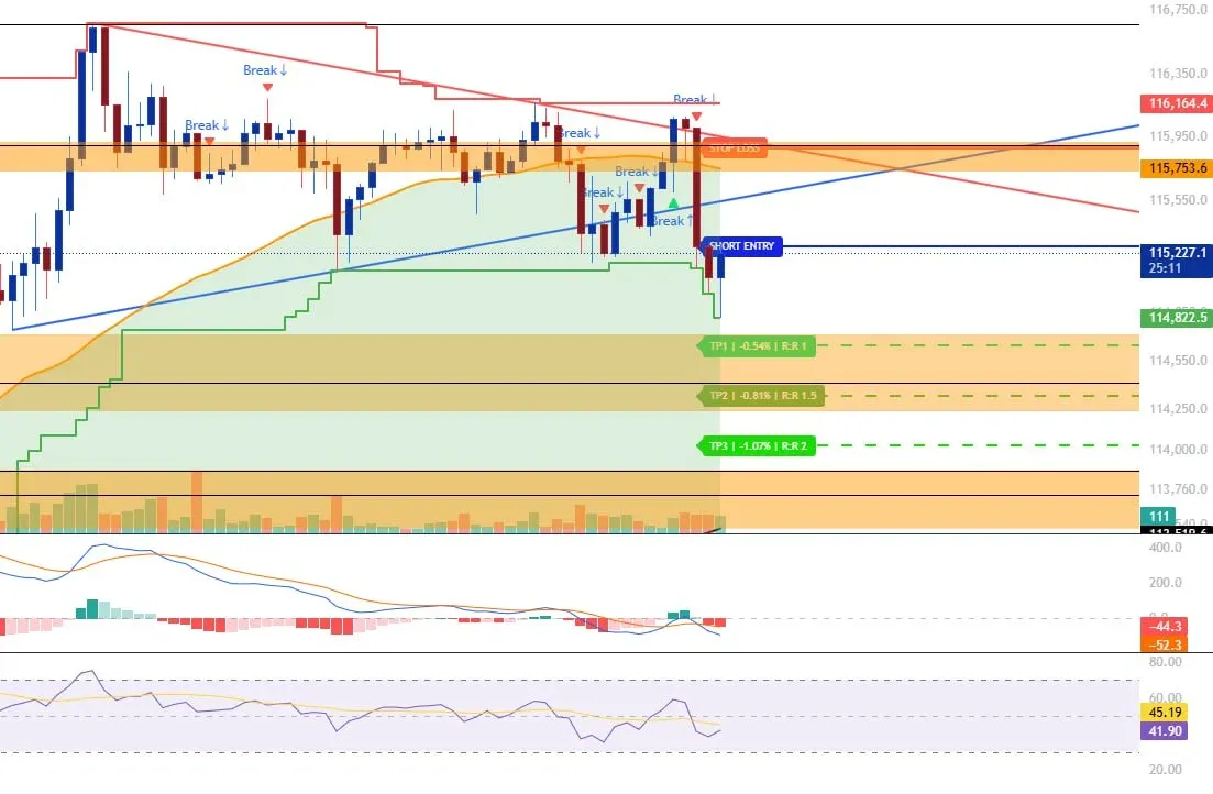 1시간봉 지지 돌파를 하며 숏 엔트리가 떴음.