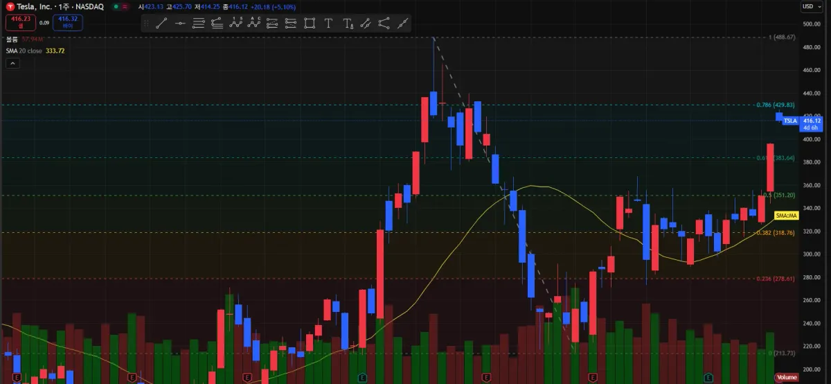 테슬라 전고점과 전저점 기준으로 피보나치 되돌림으로 설정하고 작도해봤는데, 지지랑 저항이 안맞는거 같습니다.