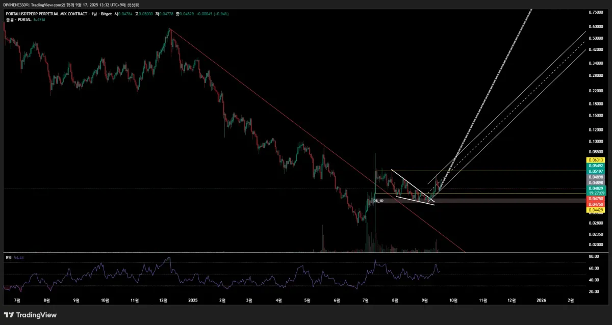 두번째 바닥에서 하방 쐐기 패턴으로 조정 후 상승 진행 중