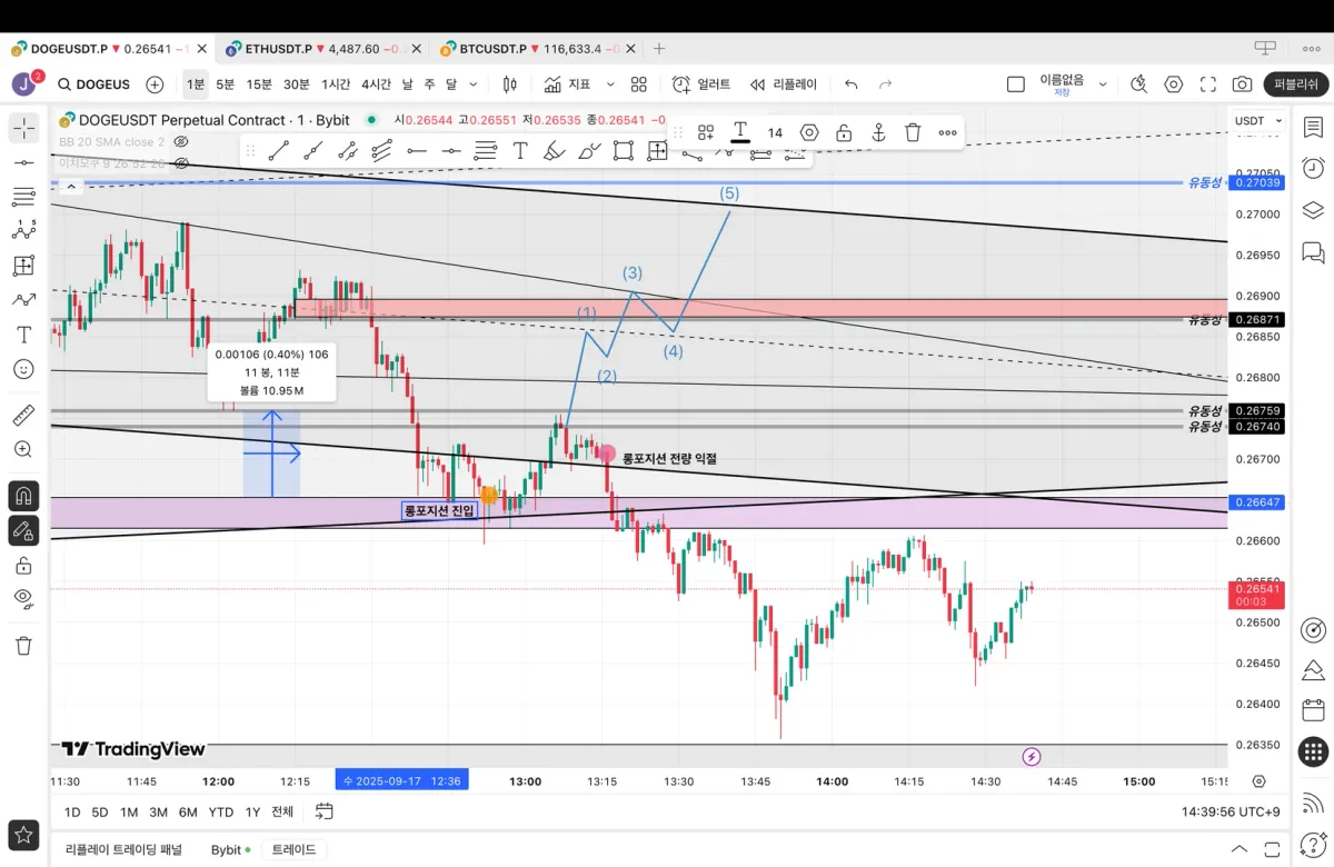 - 0.26759불에서 유동성이 큰 구간을 하방 돌파 하였지만 아래에 매물대와 오더블럭 등 지지라인이 많았기때문에 테스트까지 대기