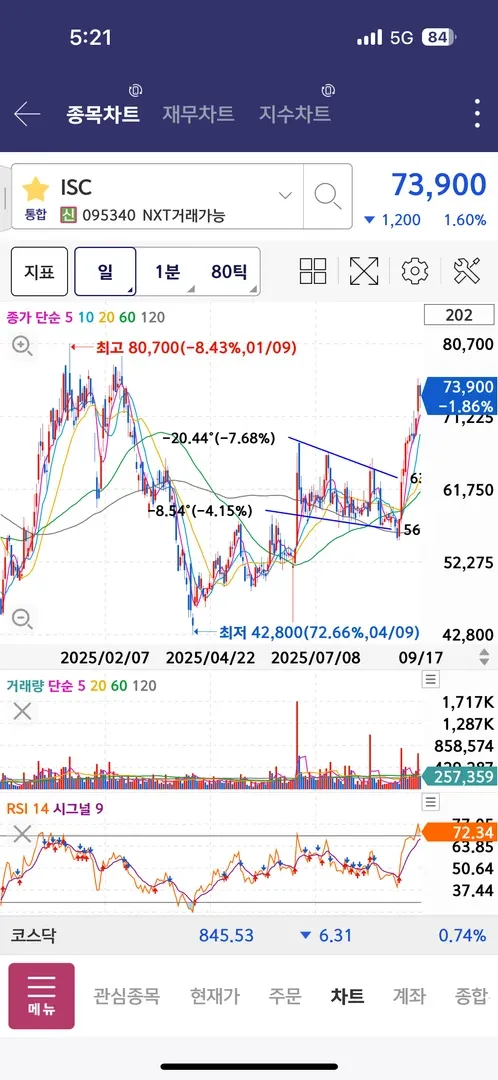 1차 매수하고 하락할 경우, 0.618인 72,600원 지지 못하면 더 바닥으로 하락한다고 생각해서 72,000원을 손절라인으로 생각했습니다.
