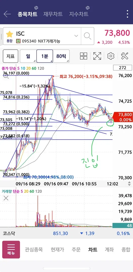 진입시점은 피보나치 되돌림에 의해 0.5인 73,300원으로 생각했는데 오차범위를 생각하여