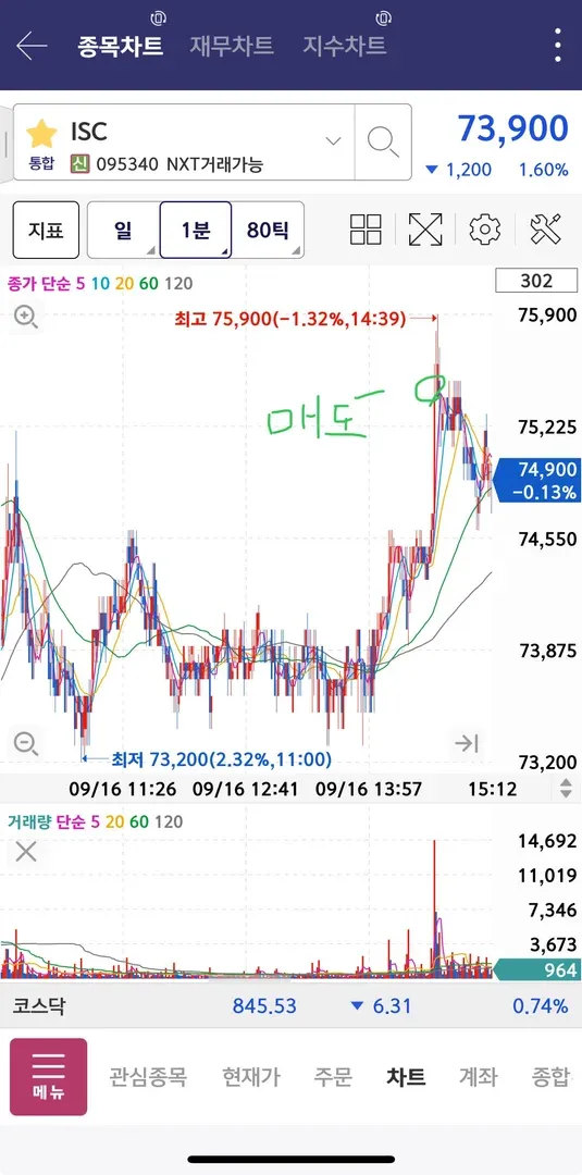 다행스럽게도 1차 73,300원에 매수 성공하자마자 바로 반등하였고 73,900원에 매도할까 생각했지만 횡보구간이 나왔습니다. 강사님께서는 생각하지 못한 대응구간이 나왔을때는 빨리 손절하는 것도 좋다고 말씀하셨지만 조금 더 지켜보고 대응하기로 생각했습니다. 2시간 가량 횡보한 뒤 다시 상승하였고 75,500원에 매도했습니다.