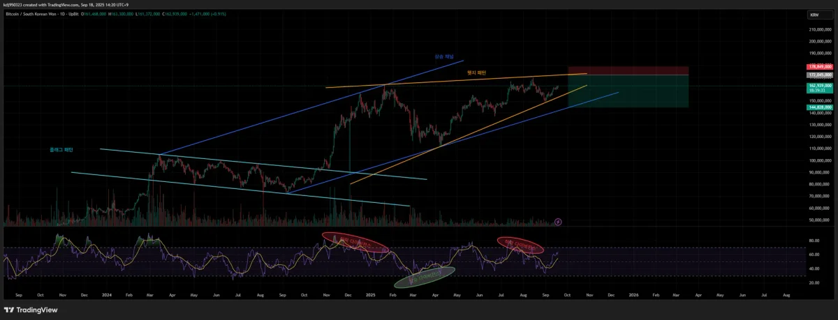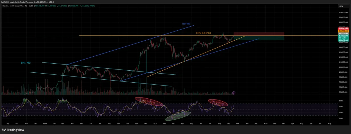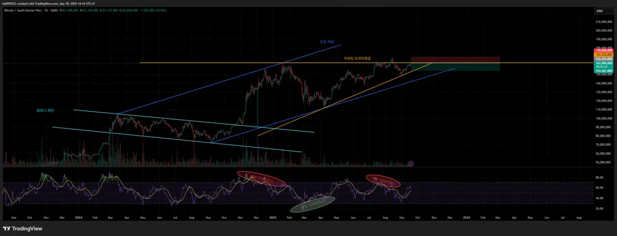 이전부터 큰 상승 채널 안에서 움직이고 있다고 생각했으며 현재는 상승채널 안에 어센딩 트라이앵글이 존재한다고 생각해 작도해봤습니다.