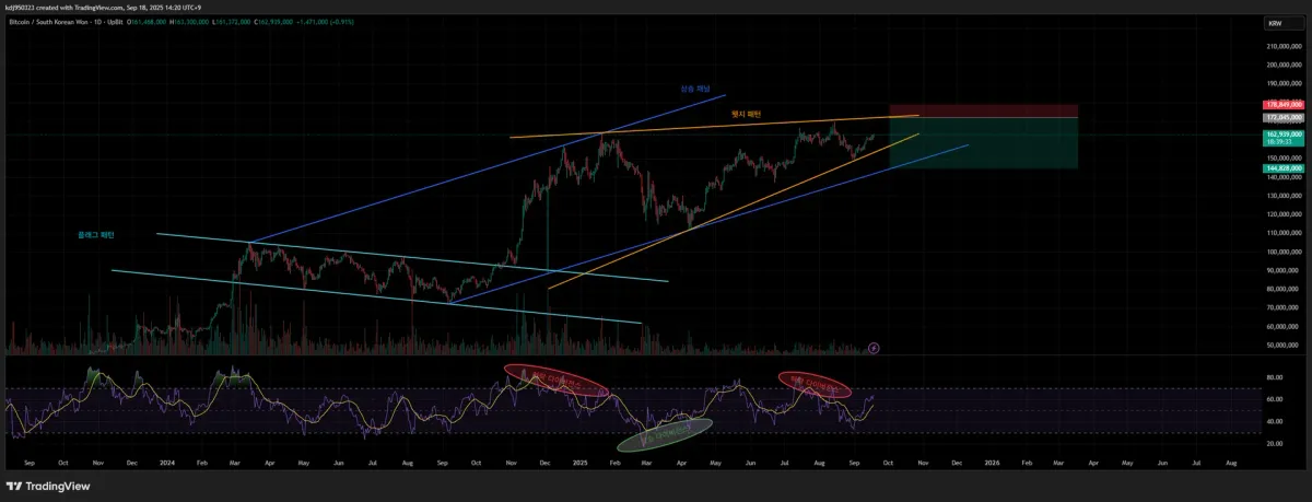 웻지패턴이라면 상승채널 하단 지지선까지 하락할 가능성이 열려있어 손익비가 더 좋은 구간이 나올 수 있을 것 같은데 그러기위해서는 웻지패턴의 상단 저항선까지 도달해야해서 아직까진