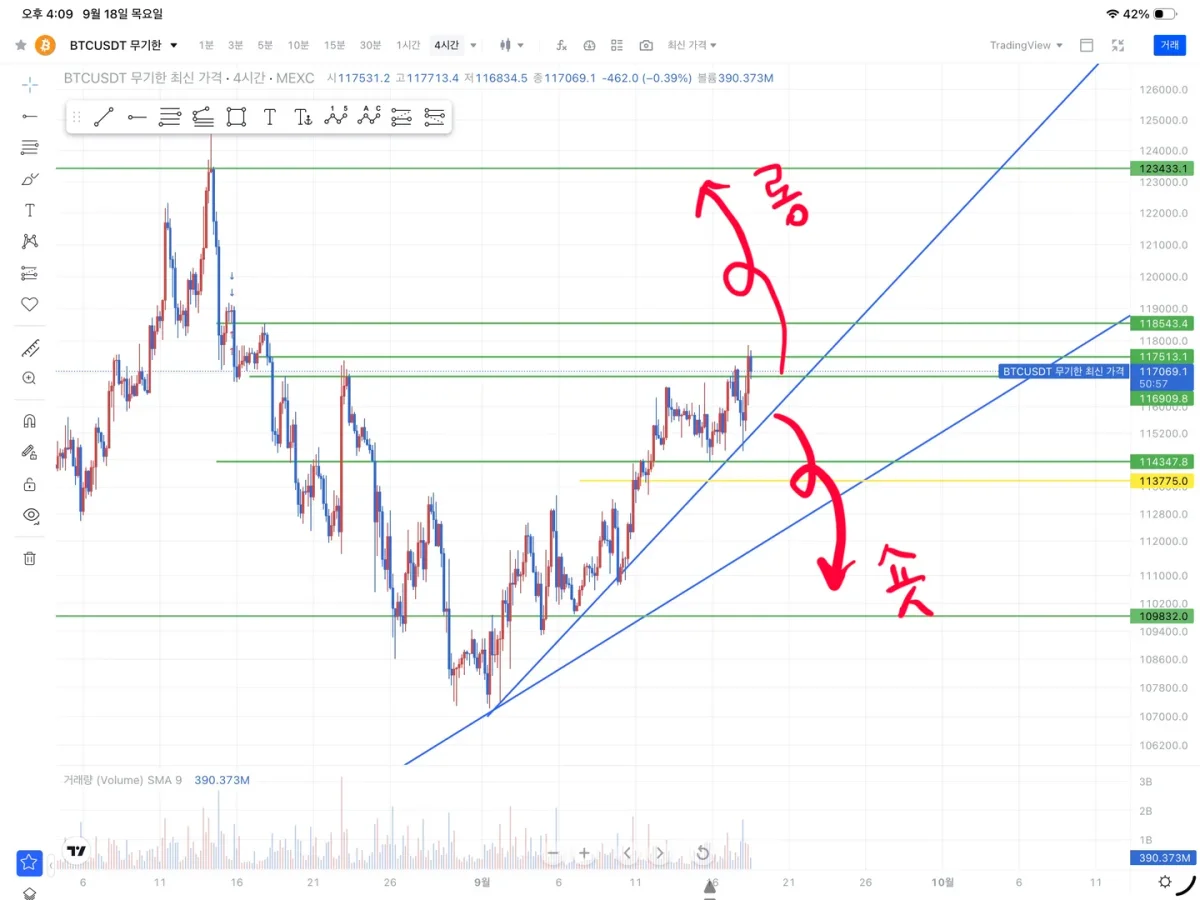 기다렸다가 115~116k까지 눌리면 롱,, 지지하지 못하면 숏으로 매매 할 계획입니다.