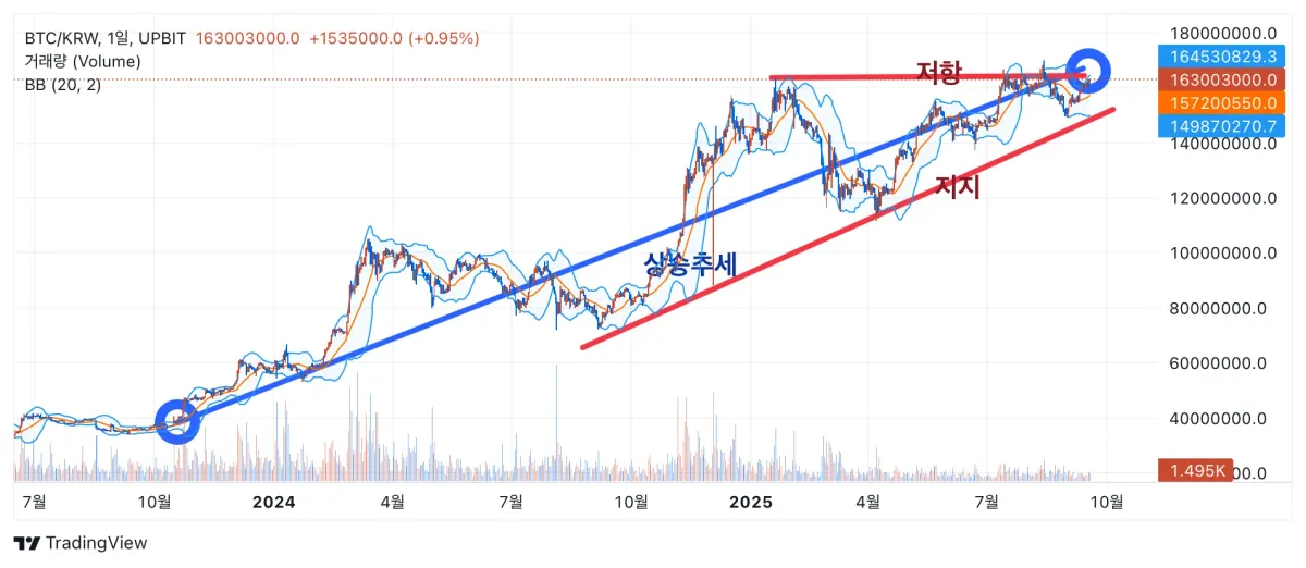 저점을 이어서 지지선을 그렸고 고점을 이어서 저항선을 그렸습니다.