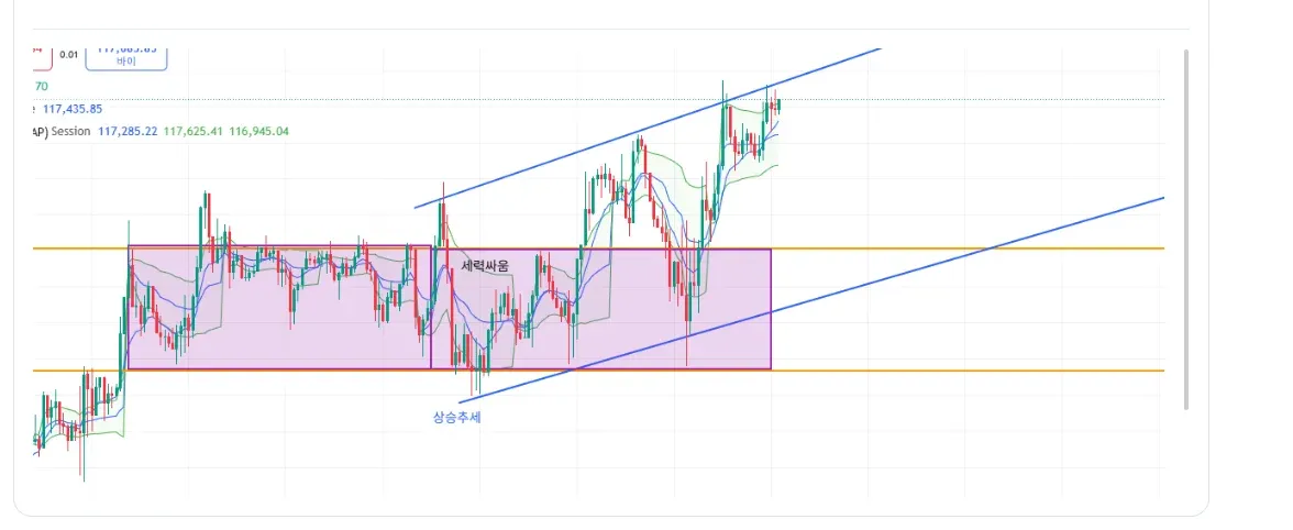 현재 아직 2강을 본 수강생입니다 현재로서는 많이 부족하고 차트 보는게 서툴지만 제가 보기에는 112k가 단기 지지 124k가 주요 저항으로 보이며 현재는 반등 추세에 있습니다. 하지만 전고점을 돌파하지 못하면 다시 조정이 올 수 있을거 같습니다. <- 카톡 내용과 똑같습니다. 그리고 1번 미션 즉 이 글과 2번 미션의 시각이 두~세 시간 정도 차이가 났습니다. 그로인해 제가 분석한 결과가 조금이나마 정답과 가깝게 가지 않았을까 생각합니다. ( 위 사진은 복습을 토대로 이더리움 선물 차트를 그려봤습니다 ) 수정할점, 피드백 적극 환영합니다 :)