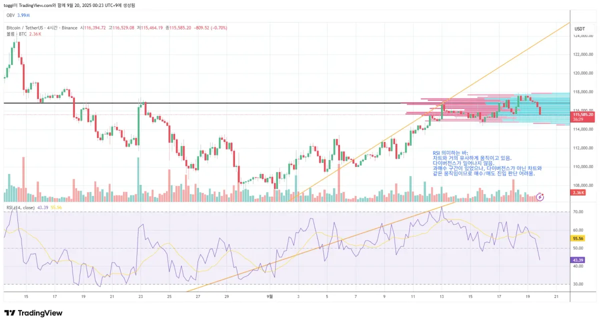 현 시점에 RSI에는 다이버전스가 보이지 않고 있습니다.