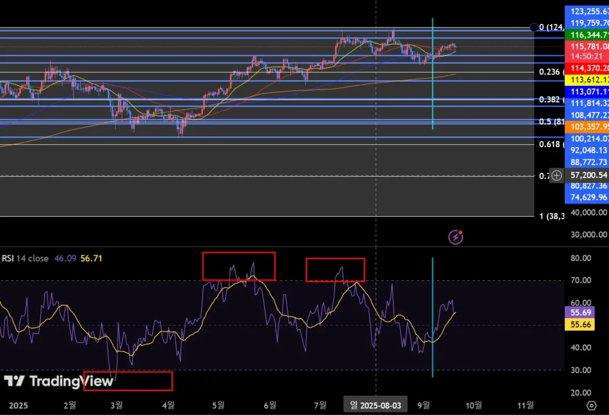 비트코인 일봉이며 , 과매도,과매수 구간에 추세 전환 대비