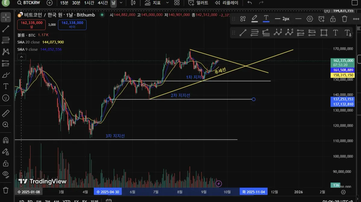 일단은 상승 추세에 있는 것 같지만 삼각형 윗변의 추세선을 돌파하는지 여부와 1차 지지선이 지켜지는지에 따라 대응이 필요할 것으로 보입니다.