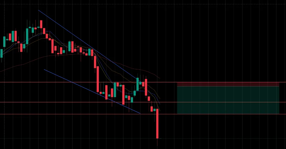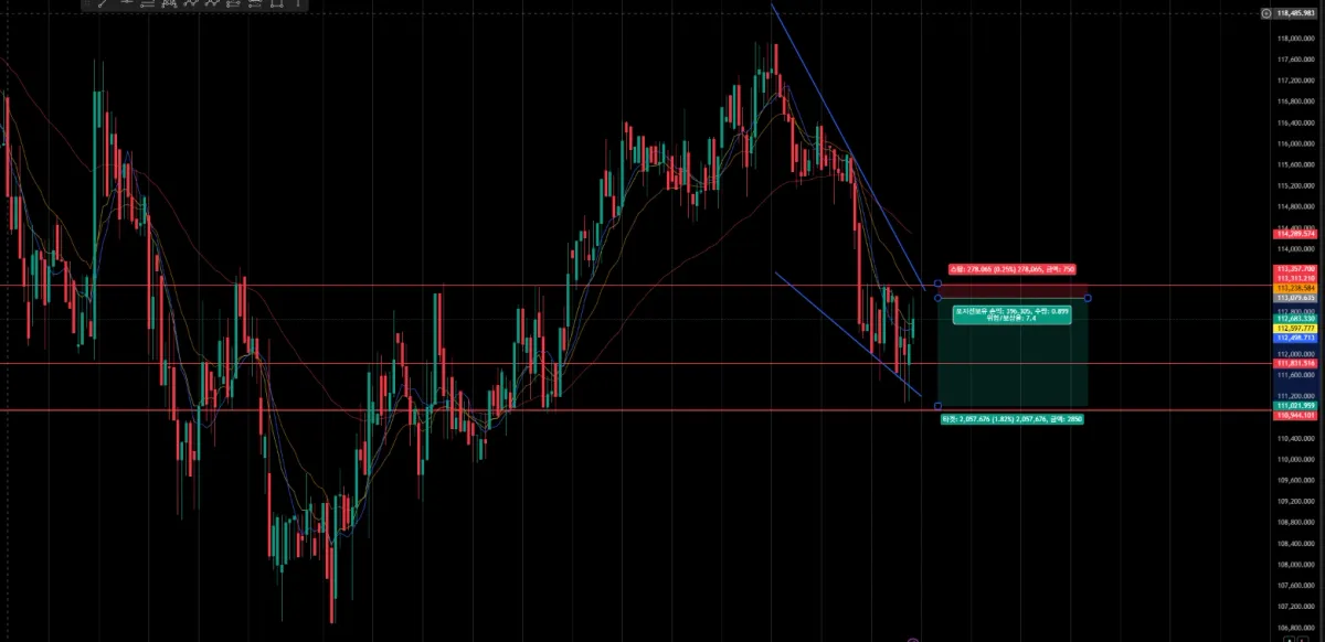 117.597에 숏포지션으로 들어가고 113,325에 손절 스탑, 111,842에 반익, 110,949에 나머지 익절을 생각하였습니다.