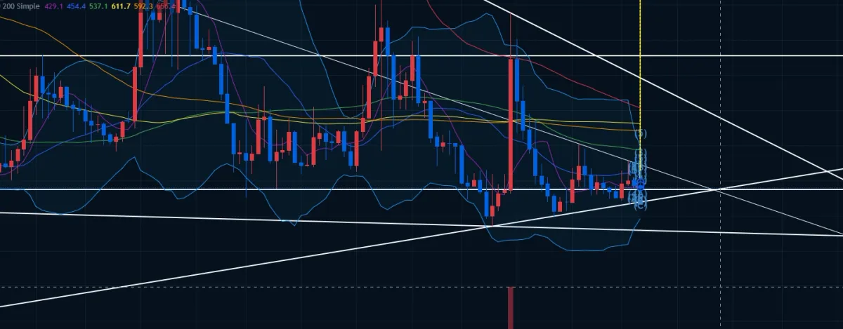 주봉에서 424 지지선이 강력크해보이고 삼각수렴 보임