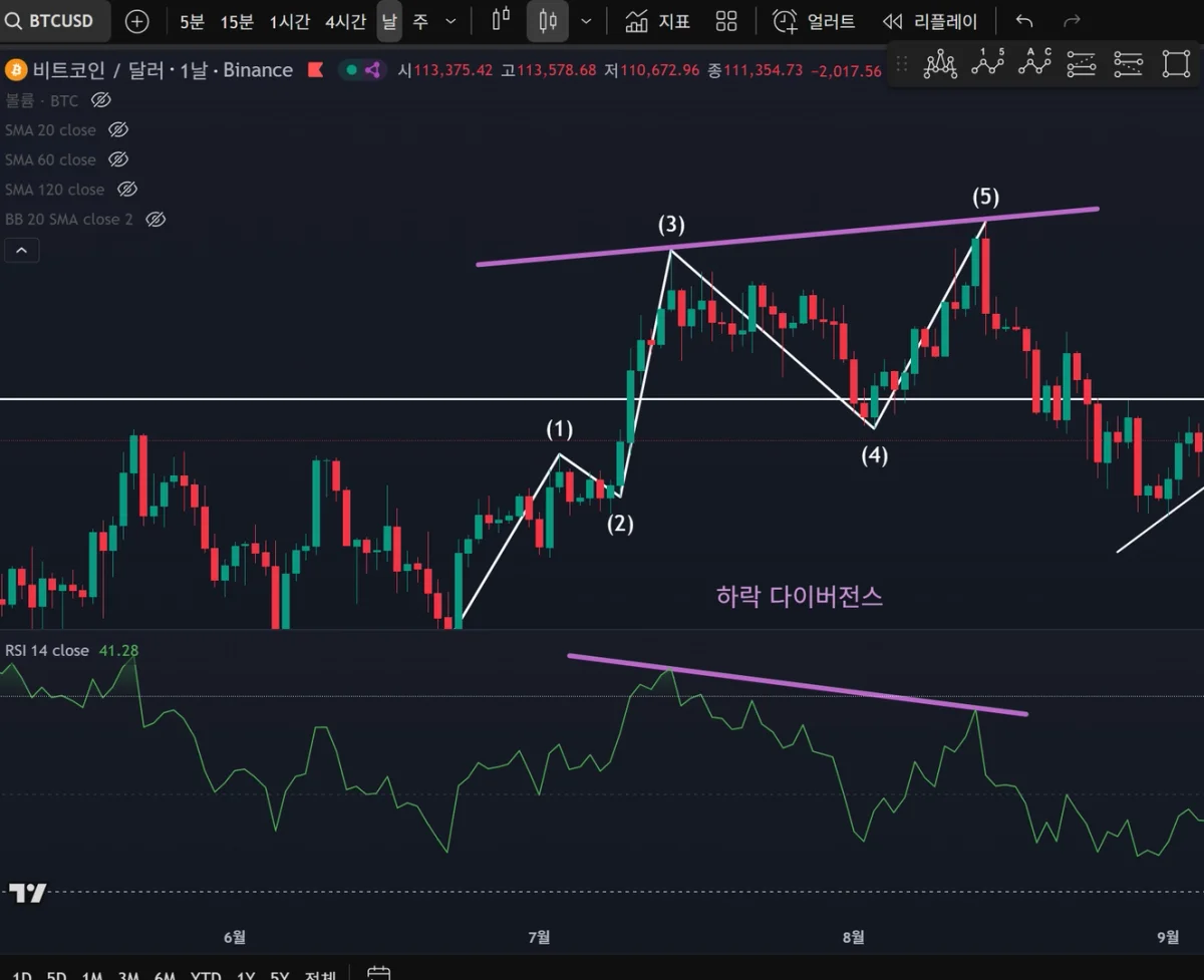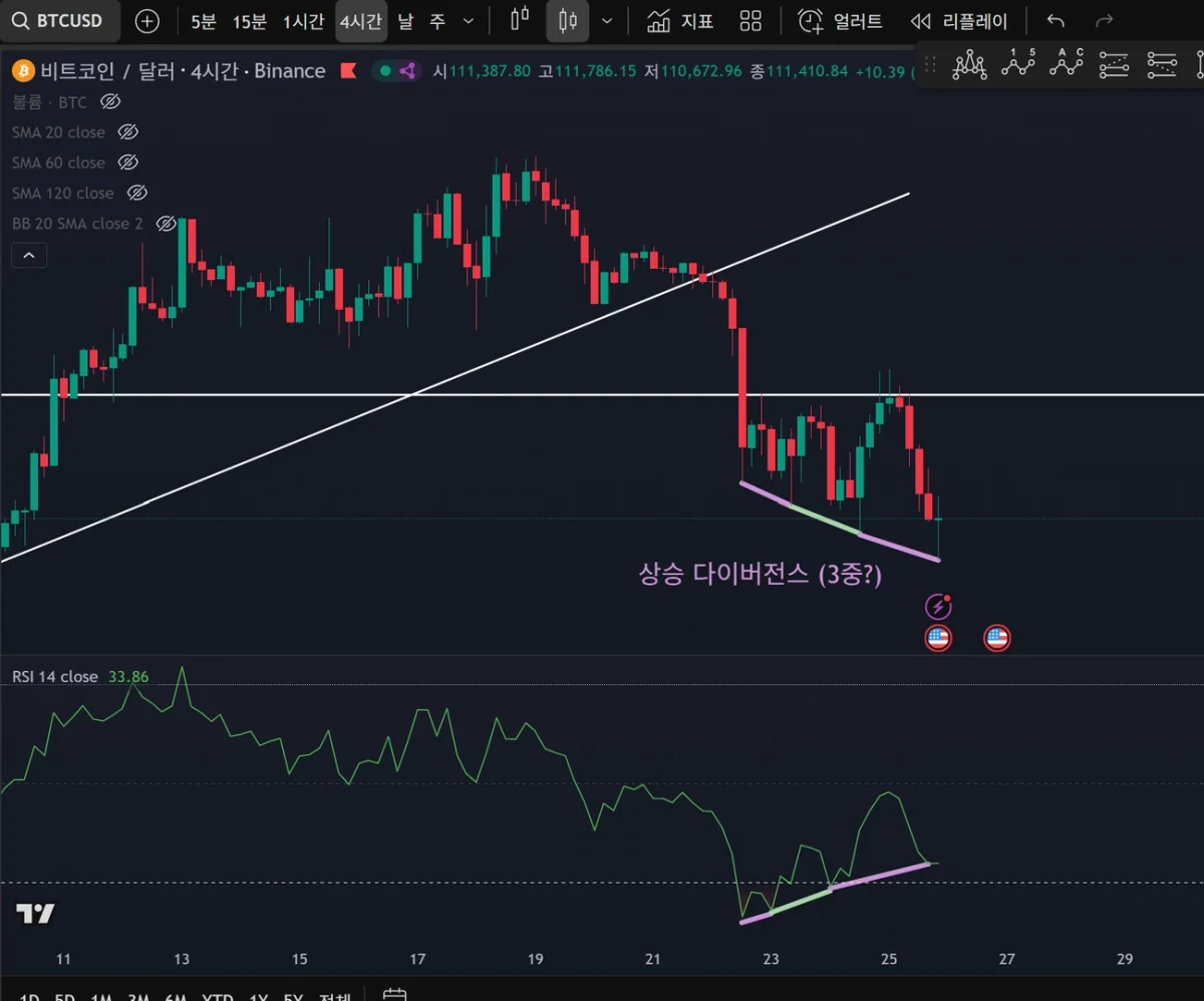 주로 날봉과 4시간 봉을 활용하여 다이버전스를 체크해 보았습니다. 확실히 RSI 30 이하 구간과 70 이상 구간에서 확인되는 하락 또는 상승 다이버전스가 더 잘 보이는 점이 있었습니다. 또한 엘리엇 파동과 RSI 를 함께 사용했을 때 다이버전스 확인이 훨씬 수월했습니다. 강사님께서 강의에서 말씀해 주신 것처럼 다중 다이버전스를 주의해야 한다는 부분도 다시 체감했습니다. 실제로 아래 차트에서도 2중, 3중 다이버전스가 발견되는 것을 보니, 실전에서는 첫 번째 다이버전스가 나타났다고 해서 역추세 매매로 섣불리 진입해서는 안 되겠다는 생각이 듭니다.