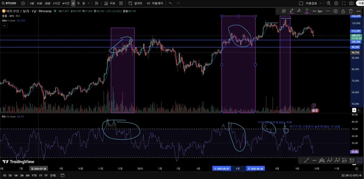 제일 왼쪽에 있는 차트는 가격은 올라가지만 RSI는 내려간다. 중간에 있는 부분은 가격은 동일하지만 고점은 내려가있다. 제일 오른쪽에 있는 차트도 같다.