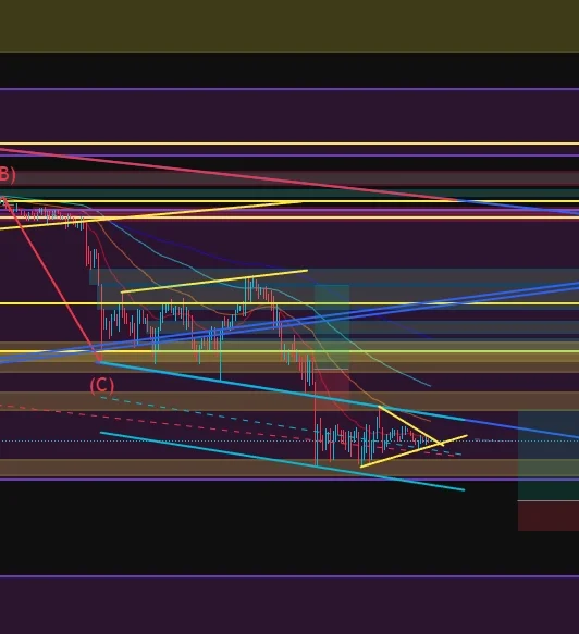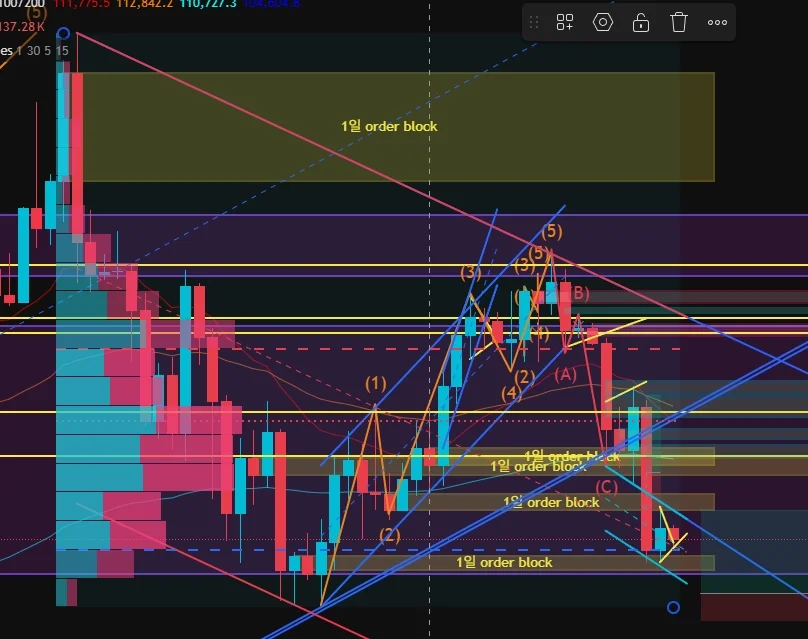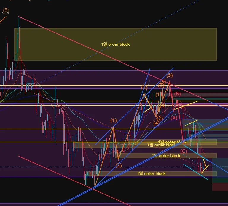 큰 하락 추세의 채널(빨간색 페레럴 채널)의 중간선의 지지를 받는 중인 듯 하나, 리테스트 또는 하락이 나와야 롱과 숏을 판단 할 수 있으며 현재 시간 기준 리테스트를 받는 것으로 판단 ==> 롱 진입 유리