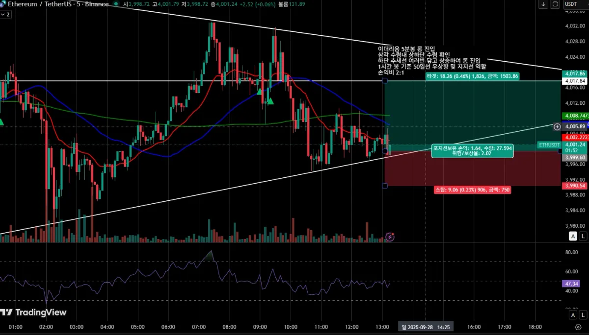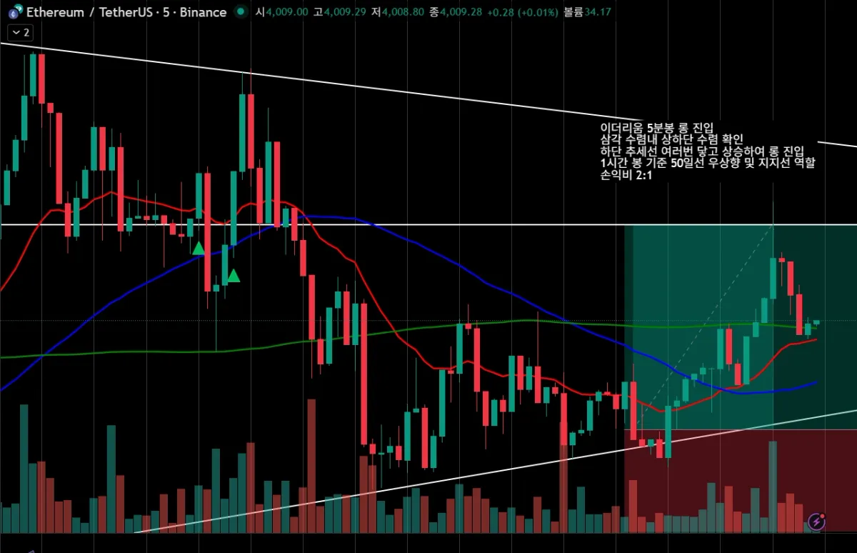 하단 추세선 여러번 닿고 상승하여 롱 진입