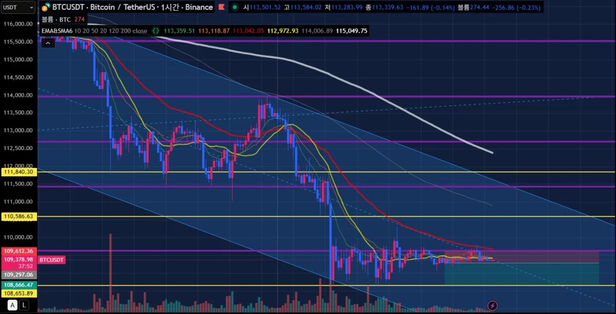 최근 지지선(노랑)과 피보나치 중간선(보라)에서 횡보하는 것이 보여