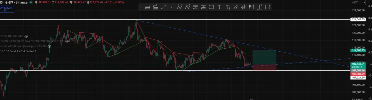 하단의 강한 지지선과 높은 저항선 및 수렴하는 차트의 모양