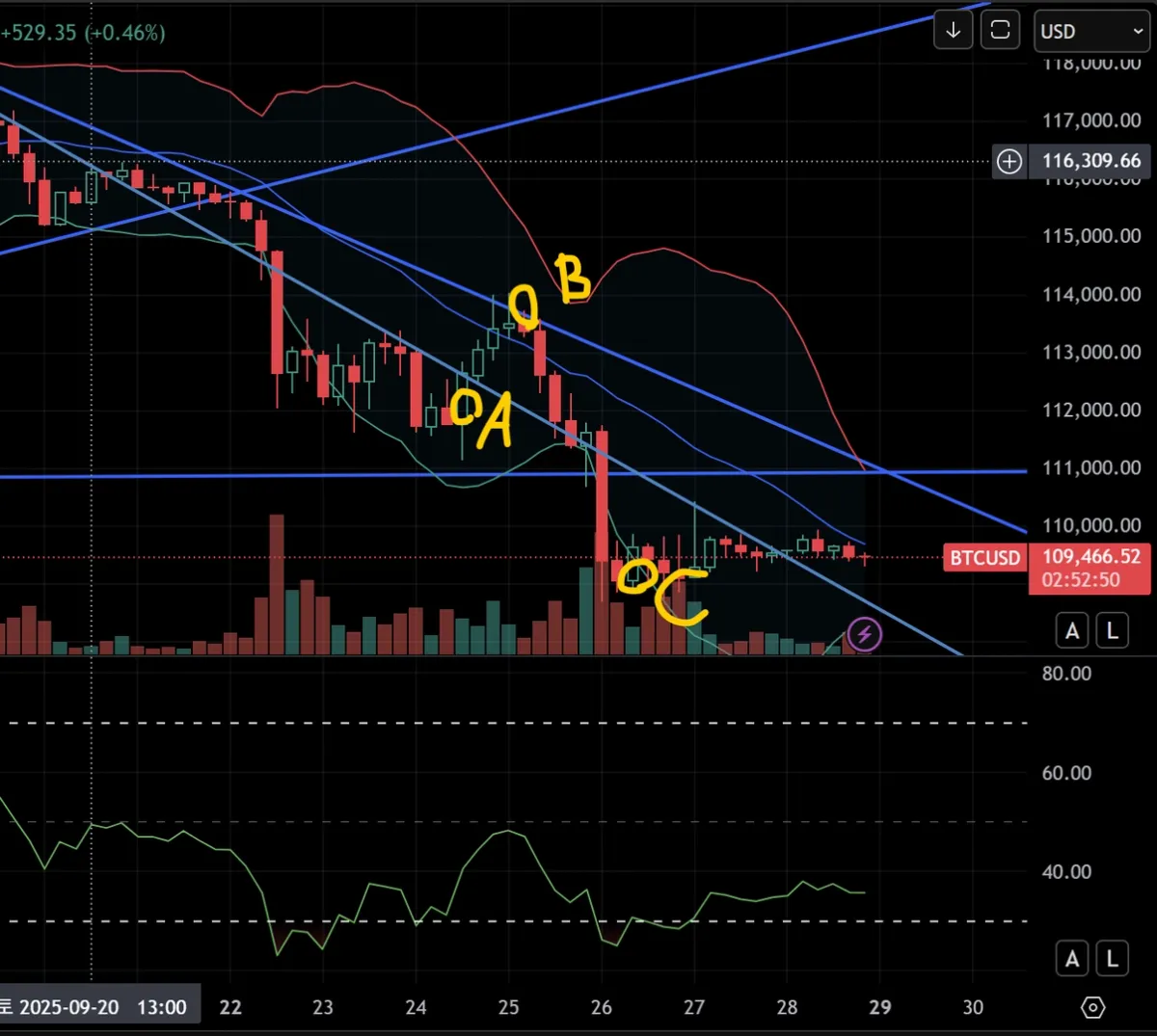 대추세가 하락이라서 숏 기회를 보고있었습니다. 정석적으로는 B지점에서 추세 상단에서 이탈 후 돌아오는 시점에 숏포지션 들어가는게 제일 승률이 높으나, A지점에서 전저점을 낮추는 모습을 보고 그대로 하락추세를 이어간다고 생각해서 숏포지션을 잡아서 매우 위험한 거래를 하게 되었습니다.