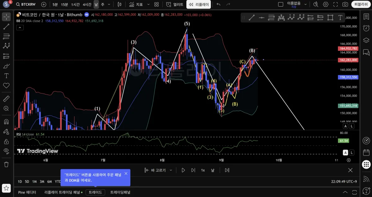 535파동의 3구간으로 (c)에서 떨어질 것 같았는데 한번 더 오르는게 보이길래 볼린저밴드 상선을 기준으로 봤을 때, 조금더 오를수있겠다고 판단하여