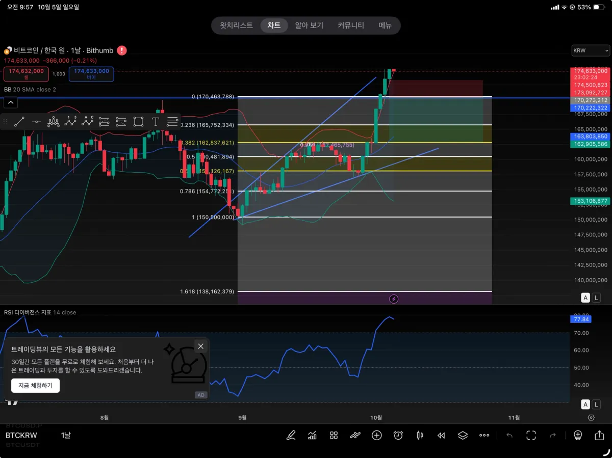 웻지패턴으로 판단하고 피보나치에 0.382 구간까지를 손익비 구간으로 설정후 숏포지션으로 진입하였습니다