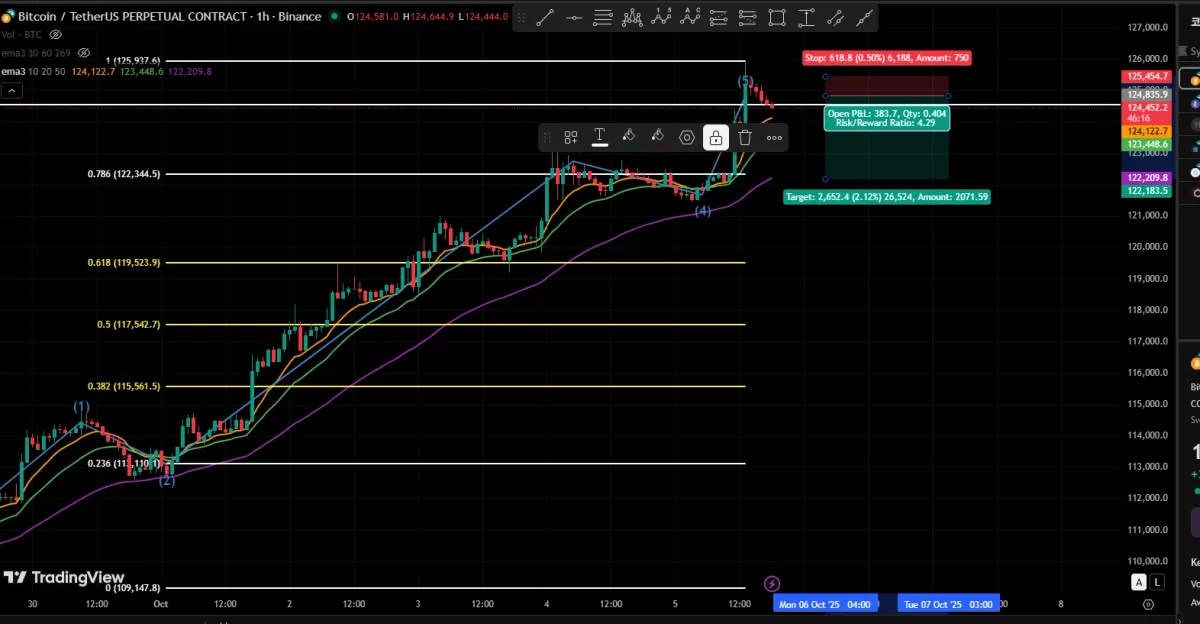 전체 자산의 2% 손실을 적용해서 투입금액 734USDT로 들어갔다. 목표가는 피보나치수열 0.786과 이전 수평 지지선을 기준으로 122,183으로 설정하였습니다.