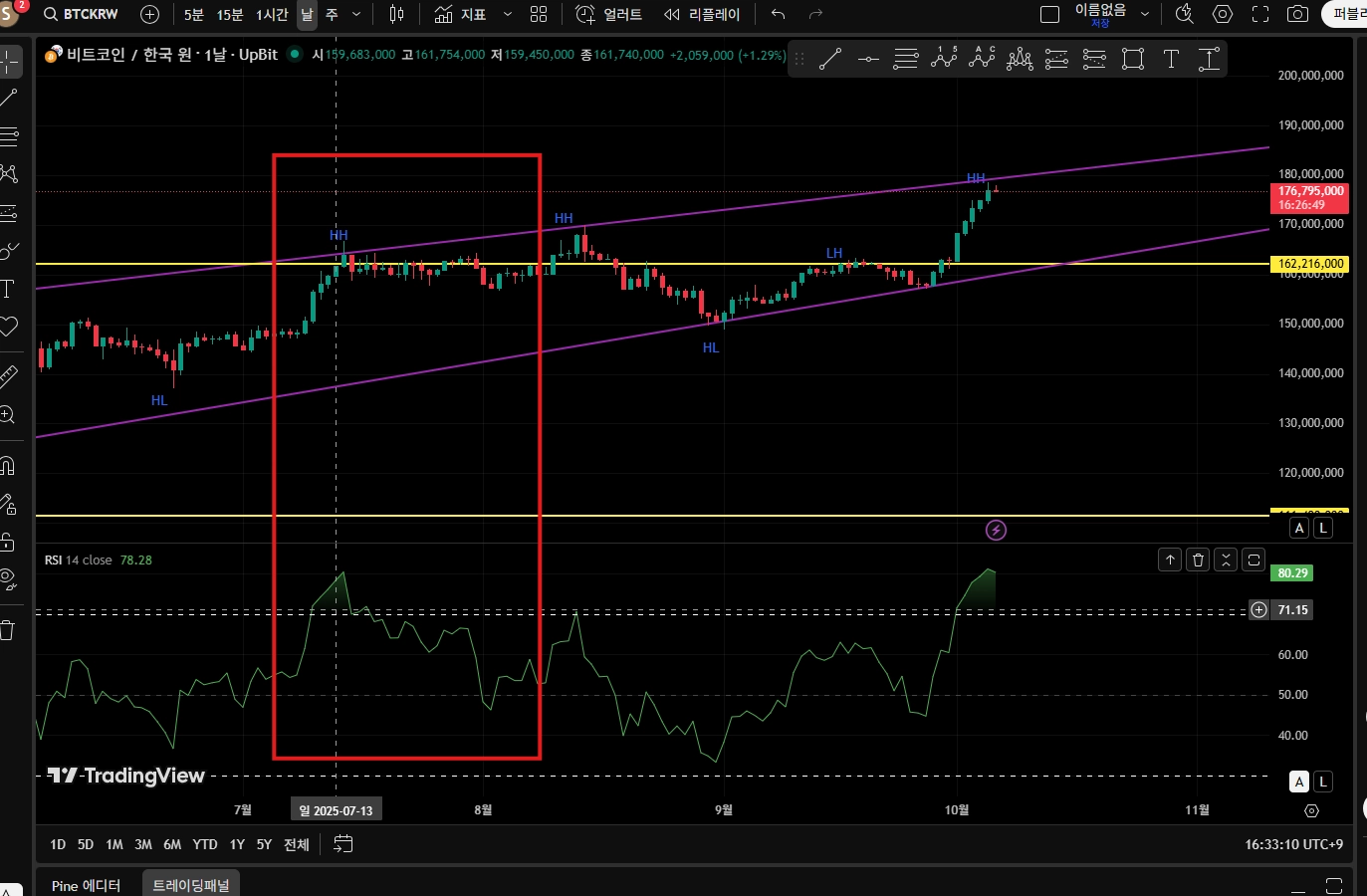 상승추세가 강해지면서 RSI가 70을 돌파했으나 주가는 횡보 중이고 RSI가 50까지 하락함