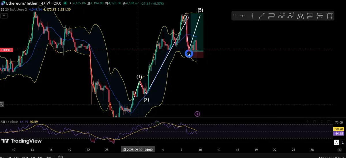 추가로, 볼린저 밴드를 이용해, 하락 4파가 볼린저 밴드 하단선에 맞았으므로 지지를 받아 가격 상승이 나올 것이라 예측하여 진입함.