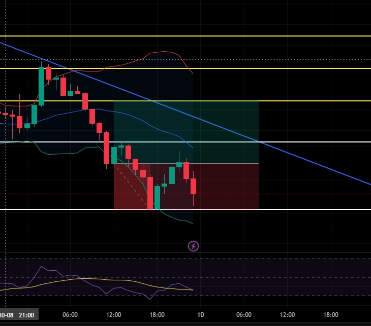 매수 근거 : 볼린저 밴드를 보았을 때 밑 부분을 찍고 올라오는 것을 확인했고, RSI도 30 정도로 과매수라 주가 상승 여력이 있다고 판단하고 롱으로 진입.