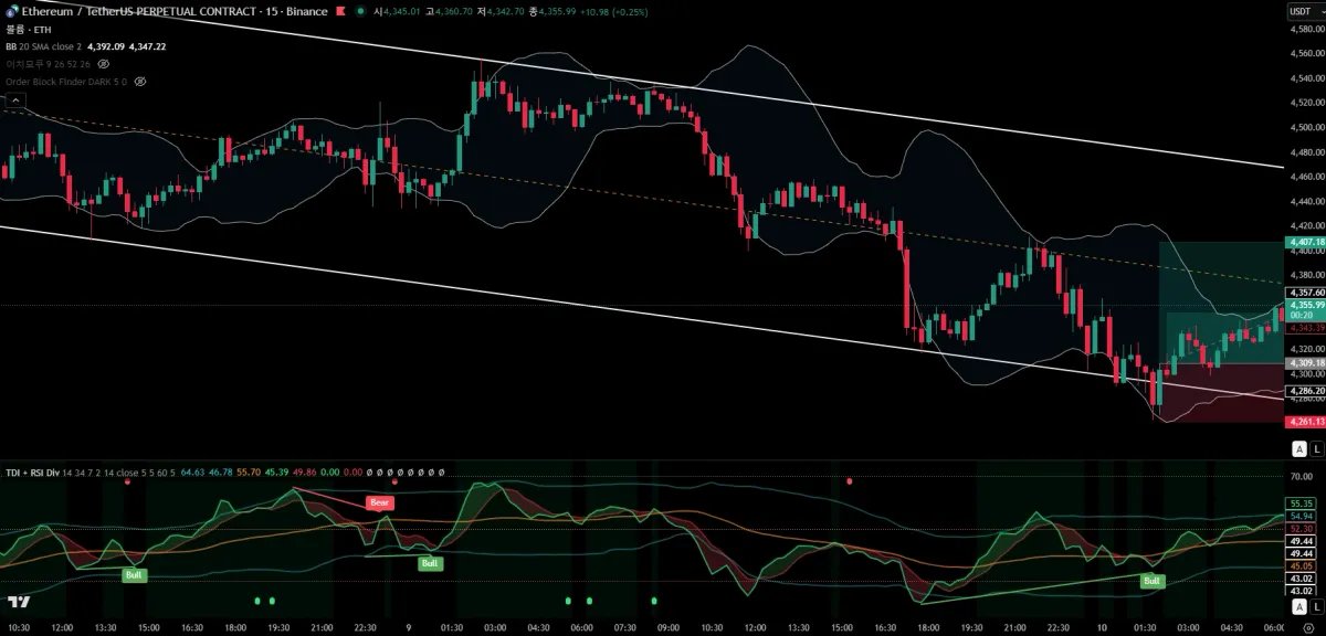 볼린저 밴드 하단과 작도했었던 추세선 하단이 겹치고 RSI 다이버전스가 발생함.