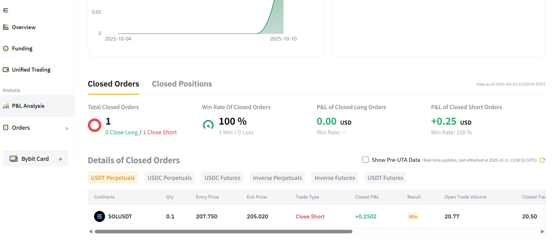 결과는 +$0.25, 아주 작은 금액이지만 첫 실전에서 수익으로 마감!