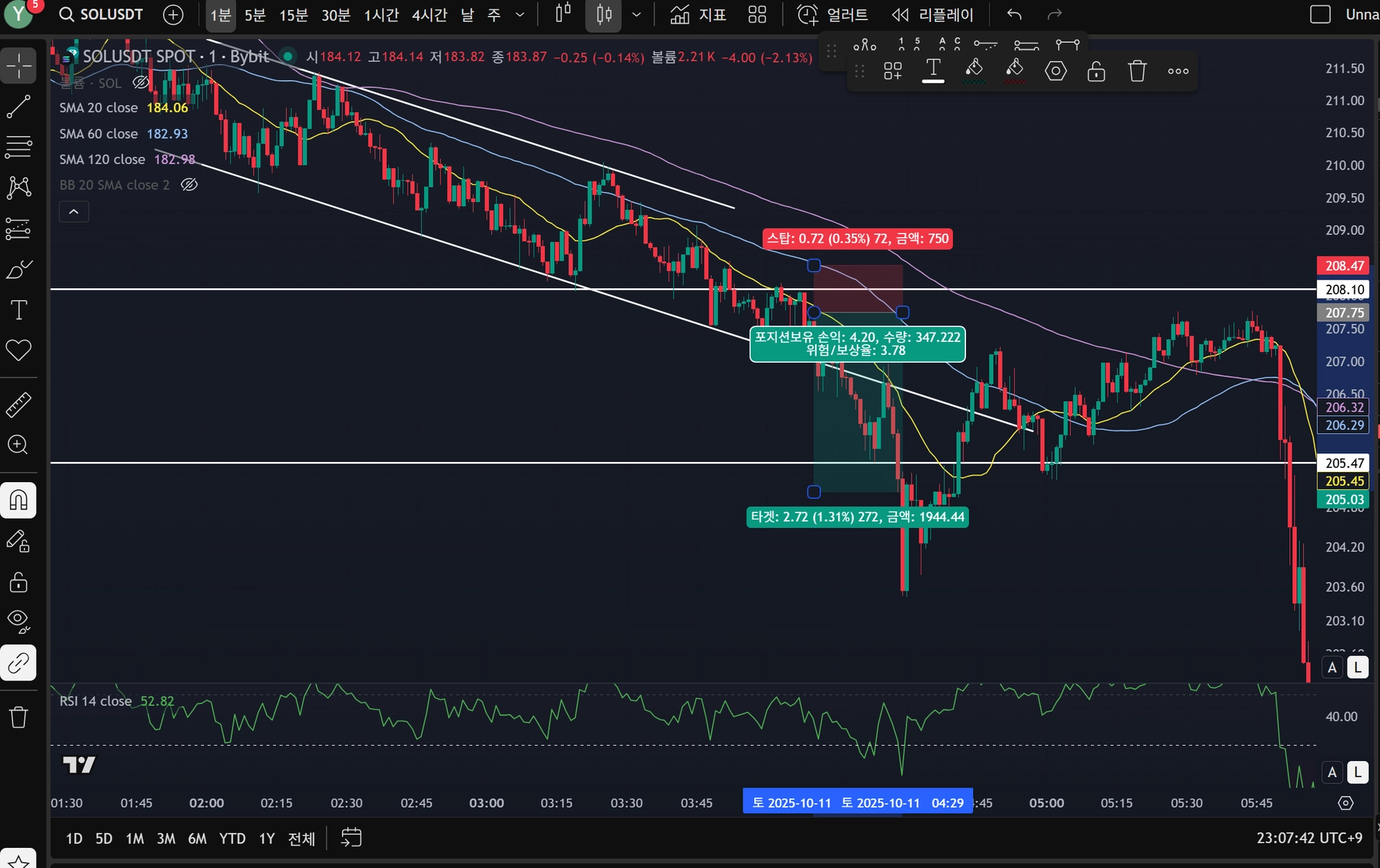 다음 캔들이 208.10 라인을 한 번 더 터치하는 걸 보고, 이어지는 음봉에서 숏 포지션 진입.