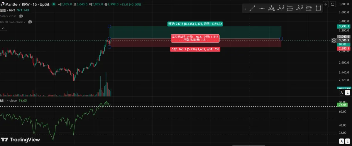 손익비는 1:1.5로 설정하였고, 아직 두 지점에 닿지 않아 손익절이 난 상태는 아닙니다.