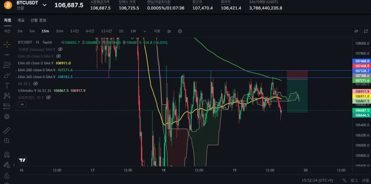 우선 주말에 횡보장이 이어졌음을 보아 위에 저항선을 그었습니다. 그리고선 200이평선에 맞는것을 기다렸습니다. 딱 맞으려고 할때, 진입을 했습니다. 이때 추세 작도한 것을 기준으로 15분봉 전에 일어났던 고점을 뚫으면 손절하려고 잡아놨습니다. -8%대에 손절, 그리고 익절가로는 진입이전에 저점이었던 곳으로 설정하고 들어갔습니다