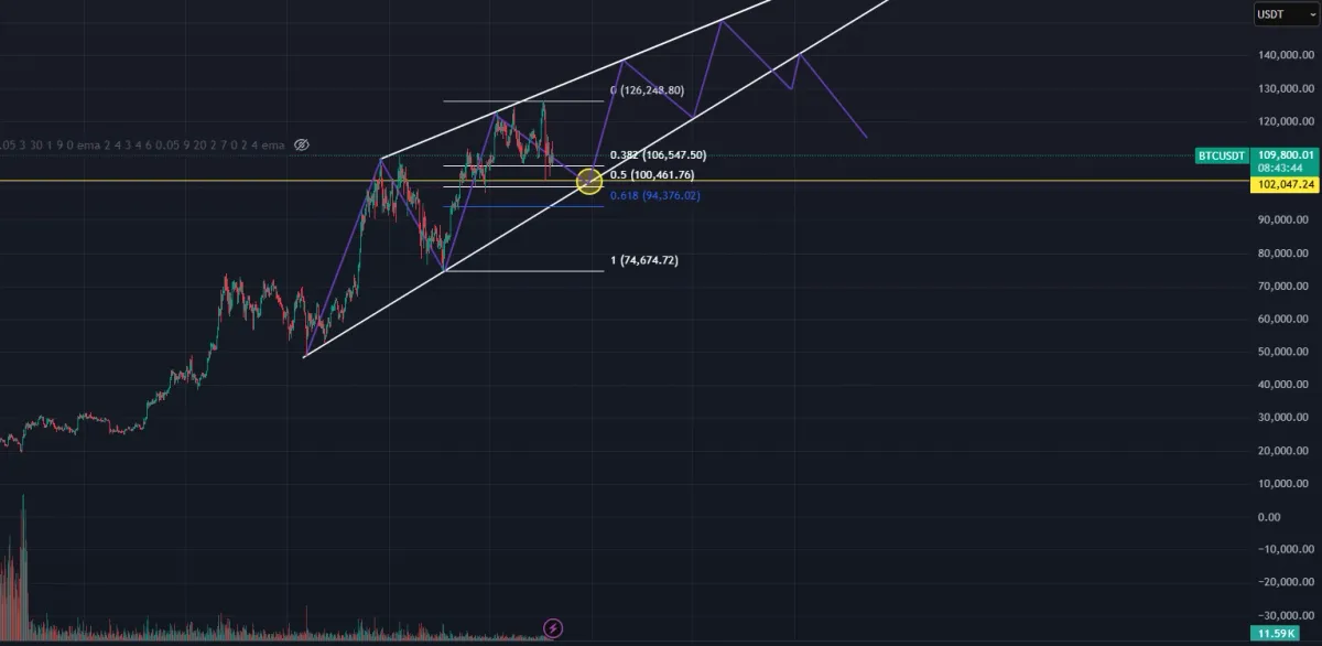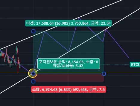 만약 노란색 동그라미 부근에서 롱포지션에 배팅한다면은 피보나치 0.618부근 이탈지점을 손절로잡고, 상승쐐기형 위쪽 추세선(저항선)을 익절구간으로 본다면